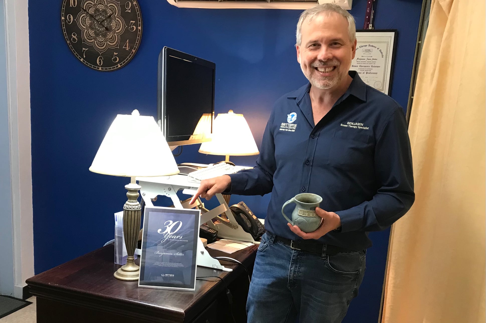At 25 years in practice he was honoured by his community and given the title of Pain Specialist, and he set up the first Bowen Therapy online Info Hub on Setter’s Health Centre Website.
