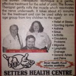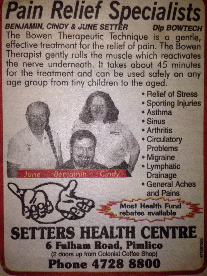 Bowen Therapy In Townsville began at Setter’s Health Centre in November of 1991, Benjamin Setter was involved in a motor accident. The injuries sustained left him with a severe spinal curvature. Through a family friend, Benjamin received one Bowen Therapy treatment every week for three months. At the end of this period Benjamin was relieved and surprised to find his spine had straightened.