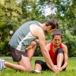 Stress fracture Sport injury – young fitness woman holding her ankle with pain, man is helping